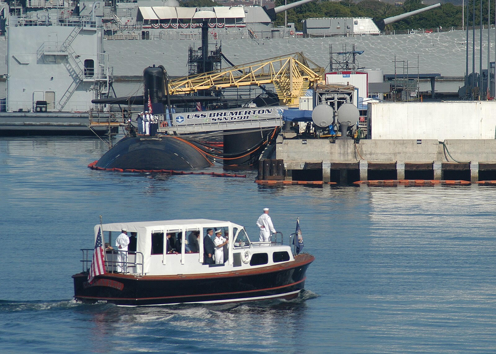 On October 23, 2003, President George W. Bush and First Lady Laura Bush were escorted aboard the barge by ADM Thomas B. Fargo, Commander, U.S. Pacific Command. Their visit included the retired battleship USS Missouri (BB-63) and the USS Arizona Memorial. As they passed, sailors aboard the USS Bremerton (SSN-698) rendered honors — a powerful tribute to the Commander-in-Chief aboard this historic craft.