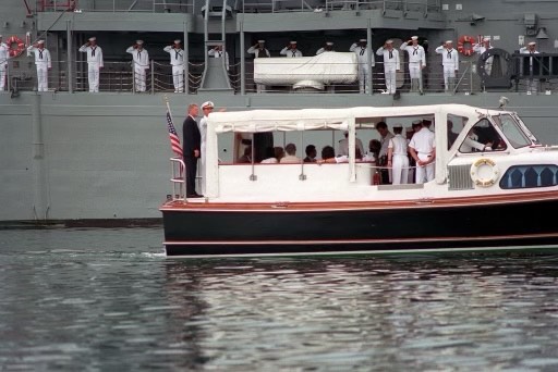 On December 7, 1991, the 50th Anniversary of the attack on Pearl Harbor, President George H. W. Bush and First Lady Barbara Bush were transported aboard this very barge. They were hosted by ADM Charles R. Larson, Commander in Chief, U.S. Pacific Command, for solemn ceremonies honoring the fallen.